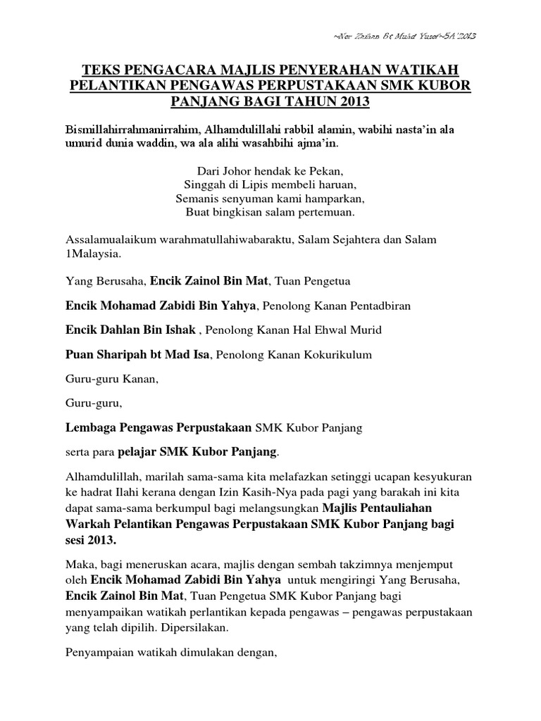 Teks Pengacara Majlis Penyerahan Watikah Pelantikan Pengawas Perpustakaan Smk Kubor Panjang Bagi Tahun 2013 Pdf